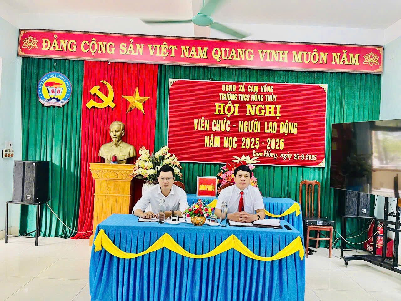 TRƯỜNG THCS HỒNG THỦY TỔ CHỨC THÀNH CÔNG HỘI NGHỊ VIÊN CHỨC – NGƯỜI LAO ĐỘNG NĂM HỌC 2025 -2026Hội nghị viên chức-Người lao động hàng năm là một trong những hoạt động ý nghĩa, quan trọng của nhà trường. Đây là dịp để nhà trường tổng kết, đánh giá, nhìn lại phong trào thi đua dạy - học của năm học vừa qua và đồng thời trao đổi, thống nhất, đặt ra phương hướng, cùng các giải pháp thực hiện thắng lợi nhiệm vụ cho năm học mới. Chiều ngày 25/09/2025 trường THCS Hồng Thủy long trọng tổ chức Hội nghị viên chức - Người lao động năm học 2025-2026.